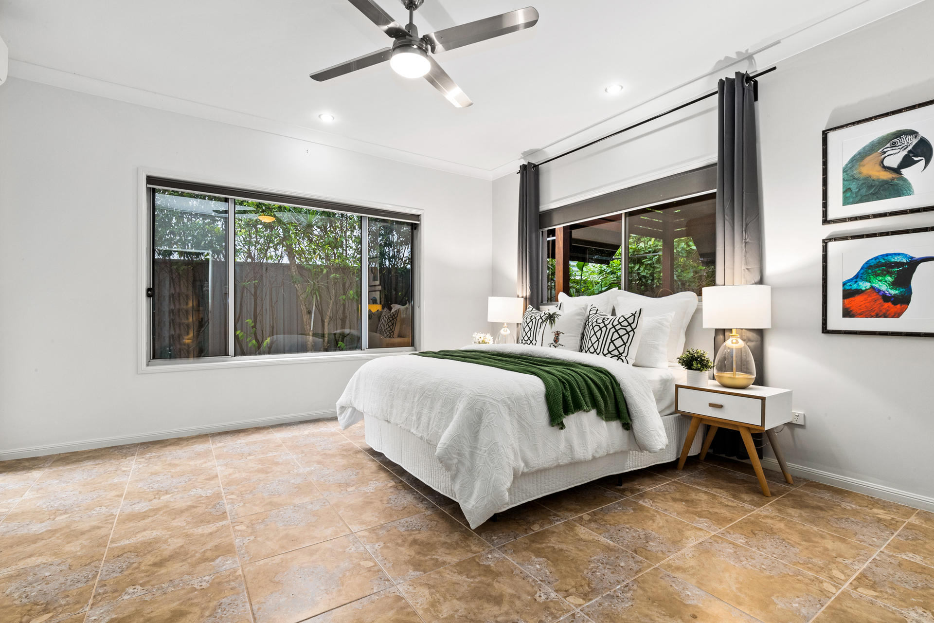 Four bedrooms are spaced over two levels with a separate built-in study offering options for a fifth bedroom, if desired. The master includes a massive walk-in robe as well as a refined ensuite with monochrome aesthetic, frameless glass shower and dual stone vanity. There are two additional bathrooms catering to the household and guests, each exquisitely presented with floor to ceiling tiling and one including a glorious bathtub. Additional features include ceiling fans, separate laundry, multiple patios and decks to capture brilliant cross ventilation, two huge sheds/storage rooms, 3 phase solar electricity and double remote garage.